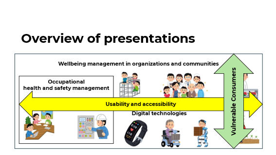 パネリストは上の図に示す各分野での国際標準化の動向について説明した。健康・安全とウェルビーイングに関わる標準化のきっかけは職場での健康安全(Occupational health and safety management)である。メンタルヘルスに関わる標準も含め今では世界各国で利用されている。