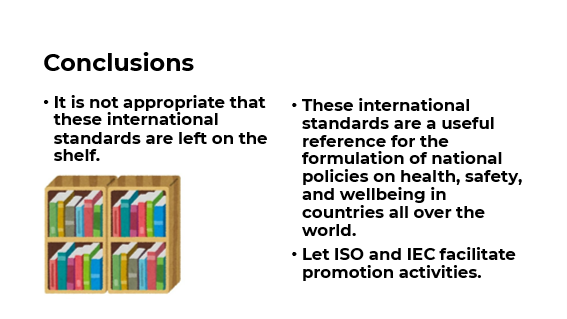 これらの国際標準が実際にどのように利用されているか、モデレータとして質問した。五人のパネリストは実例を紹介したが、普及への努力がもっと必要なことも明らかになった。フォーラムに参加していたISO会長、IEC会長にも意見を求めたが、関連組織(政府や企業、NPOなど)を巻き込んだワークショップを開催するなど、一層の普及努力が必要という意見だった。そこで下の図を示して、パネルの結論「Let ISO and IEC facilitate promotion activities(ISOとIECによる普及活動をもっと活発にしよう)」とした。